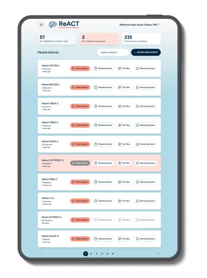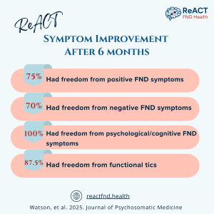 ReACT is a treatment developed by Dr. Aaron Fobian, Professor at the University of Alabama at Birmingham, that uses research-supported approaches designed to help manage and reduce the symptoms of FND by retraining control over involuntary symptoms. It uses principles of habit reversal and other evidence-based techniques to retrain the involuntary, reflexive functional symptoms, empowering individuals to regain control over their bodies. ReACT utilizes the Precision Treatment Tool, an innovative psychologist-centered digital platform.